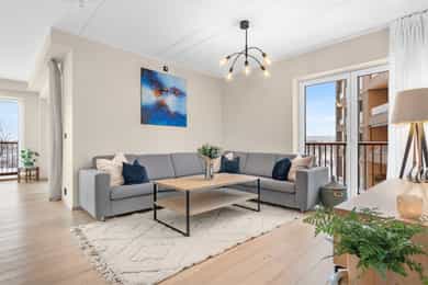 Strøken 4-roms endeleilighet med balkong, utsikt, gulvvarme, heis og garasjeplass. Nær senter og fjorden. Ingen dok.avg.