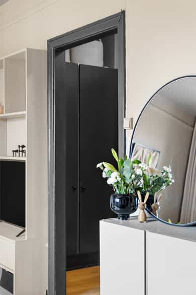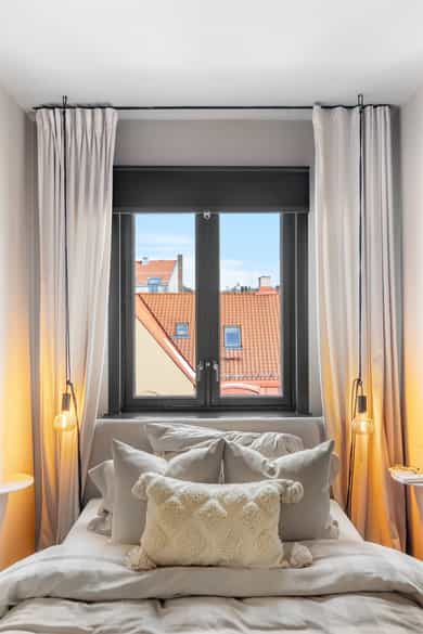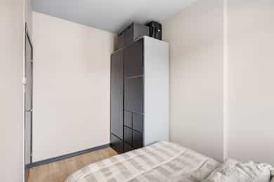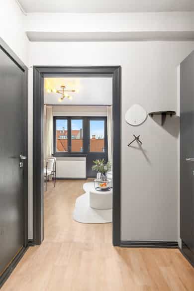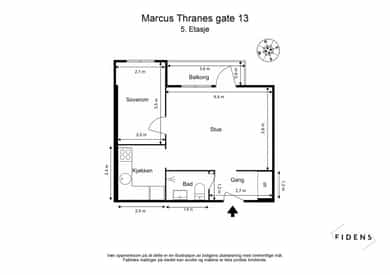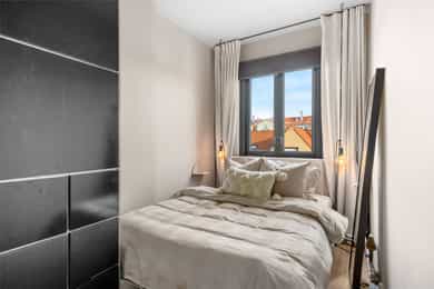 5. etasje - Entré, stue, kjøkken, bad og soverom. I tillegg disponeres en bod på 3 kvm i felles kjeller. Entré: Innbydende entré med plass til å henge av seg ytterklær og sko i innebygget garderobe. Stue: Romslig stue med plass til både sofagruppe og spisesone med spisebord og stoler. Stuen kan fordelaktig møbleres i flere naturlige soner og det er utgang til boligens balkong med fritt utsyn. Store vindusflater slipper inn pent med naturlig lys. Det er i 2021 malt alle overflater i en lun fargepalett som gir en god atmosfære. Flott spesialtilpasset bokhylle med plass til TV. Kjøkken: Separat kjøkken med funksjonell utforming og praktisk arbeidsflate. Det er montert kjøkkeninnredning med lekre mørke skapfronter. Benkeplaten er laminert og har nedfelt rund vaskekum, kombinert med krummet 1-greps armatur. Over stekesonen er det montert kullfiltervifte i rom med mekanisk avtrekksvifte. Det er opplegg for frittstående komfyr og kjøl-/fryseskap. Baderom: Flislagt tidløst baderom med wc. Gulvvarme sørger for behagelig komfort året rundt. Baderomsinnredningen er oppgradert i 2021 og inkluderer et servantskap med glatte skuffefronter, servant og 1-greps armatur. Over servanten er det overskap med speilfronter som gir både oppbevaringsplass og speilflate i en praktisk løsning. Dusjsonen er etablert i hjørne med dusjarmatur. Soverom: Boligens soverom har plass til dobbeltseng, tilhørende nattbordsmøblement og et stort garderobeskap.