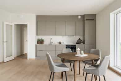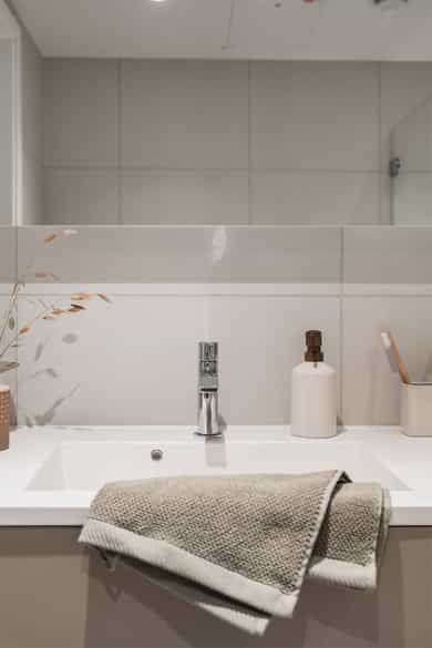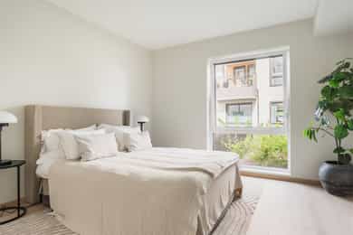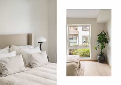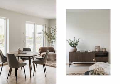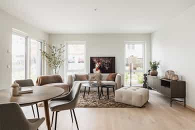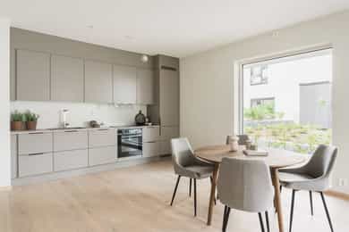 Leiligheten har et internt bruksareal på 81 m² med en gjennomtenkt og effektiv planløsning som inneholder: Stue/kjøkken, to soverom, bad og en lys og innbydende entrè. Det er et stort og sosialt oppholdsrom med kjøkken og stue i åpen løsning. Stuen får rikelig med naturlig lysinnslipp fra store vindusflater. Det er godt med plass til å innrede stuen med både sofaseksjon, stuebord og mediemøblement. Det er også plass til et hyggelig spisebord. Kjøkkeninnredningen er fra kvalitetsleverandøren HTH, som leverer moderne kjøkkenløsninger med et strømlinjeformet og rent uttrykk. LED-belysningen under overskapene er både energieffektiv og praktisk! De integrerte hvitevarene fra Siemens sikrer optimal ytelse og stil, og inkluderer induksjonstopp, komfyr med pyrolyse, oppvaskmaskin samt kjøle/- og fryseskap. Nedfelt oppvaskkum fra Blanco i modell Naya 6 Tartufo, og blandebatteri fra Tapwell. Det leveres delikate flislagte baderom med et moderne og lyst uttrykk. Servantskap med to romslige skuffer og heldekkende Kuma Square servant. Speilet over vasken er tilpasset bredden på innredningen, hvilket tilfører en ren og harmonisk finish. Leiligheten har store vindusflater som slipper inn rikelig med naturlig lys, hvilket sikrer en luftig og god romfølelse. 1-stavs hvitlasert eikeparkett, i kombinasjon med tidløse farge- og materialvalg, gir leiligheten et eksklusivt uttrykk. Vannbåren gulvvarme i stue og entré skaper et lunt og behagelig hjem, hvor varmen fordeles jevnt under gulvet. Perfekt for kalde dager, gir dette systemet både velvære og energieffektivitet, slik at du kan glede deg over en konstant behagelig temperatur, uansett årstid. Leiligheten har 2 gode soverom. Hovedsoverommet har god plass til dobbeltseng og garderobeskap. Soverom nr. 2 egner seg ypperlig som kontor eller gjesterom. Se vedlagt romskjema for utfyllende informasjon.