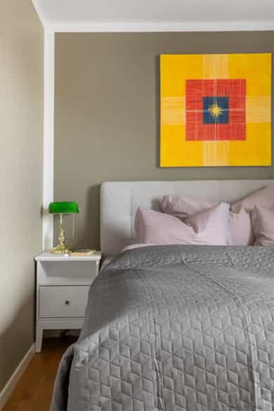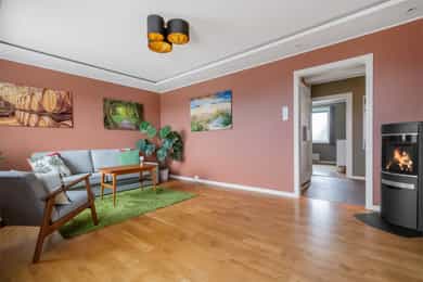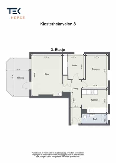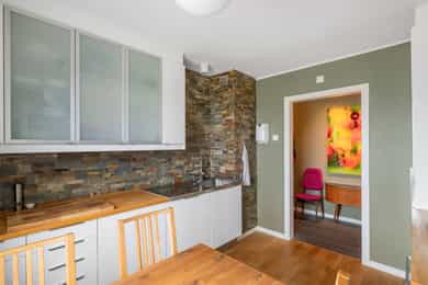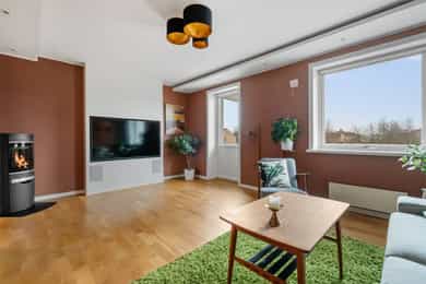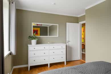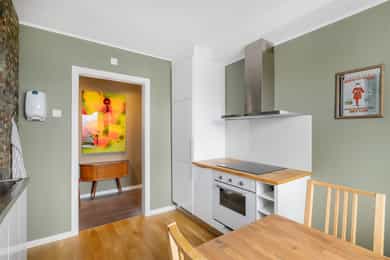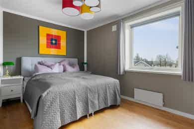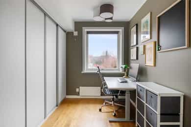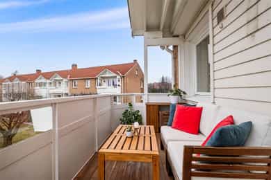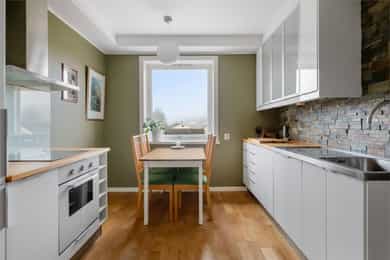 Boligen rom for rom: Entré: Romslig entré med flislagt gulv. Her er det god plass til å henge fra seg yttertøy og sko, samt mulighet for møblering med for eksempel kommode eller benk. Stue: Stue med god plass til sofagruppe og øvrig møblering. Rommet har store vindusflater som slipper inn godt med naturlig lys. Vedovn bidrar til oppvarming på kjøligere dager. Fra stuen er det utgang til en vestvendt balkong på ca. 7 kvm med plass til utemøbler. Den vestvendte beliggenheten gir gode solforhold utover ettermiddagen og kvelden. Kjøkken: Kjøkkeninnredning fra 2009 med slette, tidløse fronter og benkeplate i tre. Nedfelt vask i stål. Kjøkkenet er utstyrt med integrerte hvitevarer som platetopp, stekeovn, oppvaskmaskin samt kjøleskap med fryser. Kjøkkenet har god skap- og benkeplass og er praktisk utformet med arbeidsflater på begge sider. Ved vinduet er det plass til spisebord. Det store vinduet slipper inn godt med dagslys og gir fint utsyn. Bad: Badet er fra 2009. Vegger og gulv er flislagt, og taket er malt. Det er elektriske varmekabler i gulvet. Badet er innredet med servant med underskap, vegghengt toalett, dusjhjørne med dusjvegger samt opplegg for vaskemaskin. Rommet har naturlig ventilasjon. Hovedsoverom: Stort hovedsoverom med god plass til dobbeltseng og tilhørende møblement, samt gode muligheter for oppbevaringsløsninger. Soverom/Kontor: Soverom 2, som i dag benyttes som kontor. Rommet har fleksible bruksmuligheter og kan også benyttes som barnerom eller gjesterom. Det er god plass til diverse møblement, samt innebygd garderobeskap.