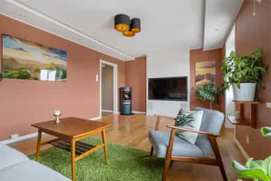 Klosterheimveien 8 ligger i et etablert og rolig boligområde på Teisen, med en sentral og praktisk beliggenhet. Her bor du med kort avstand til et variert utvalg av servicetilbud, dagligvarebutikker, skoler og kollektivtransport. I nærområdet finner du blant annet døgnåpen Joker på Teisen samt Rema 1000 på Bryn, begge innen kort gangavstand. For et større handelstilbud ligger Tveita Senter, Bryn Senter og Alna Senter en kort kjøretur unna, med et bredt utvalg av butikker, spisesteder og servicetilbud. I området finnes også treningssenter, blant annet EVO. Kollektivtransport: Området har svært gode kollektivforbindelser. Bussholdeplass ligger kun rundt ett minutts gange fra boligen, med bussforbindelse til Helsfyr - et av Oslos viktigste kollektivknutepunkt. Herfra går T-banelinjene 1, 2, 3 og 4, som tar deg til Oslo sentrum på rundt ti minutter. Det er også kort gangavstand til Bryn stasjon med togforbindelser. For deg som kjører bil er det enkel adkomst til hovedfartsårene Ring 3 og E6. Friluftsliv: Teisen er kjent for sine grønne og trivelige omgivelser med parker, lekeplasser og åpne grøntarealer i nærmiljøet. Turstiene langs Alnaelva gir fine muligheter for spaserturer både mot sentrum og videre mot Østmarka. Nøklevann er også et populært turmål i området, og Østmarka byr på flotte tur- og friluftsmuligheter året rundt. I tillegg ligger Valle Hovin i nærheten, med fine uteområder og skøytebane i vintersesongen. Skole og barnehage: Eiendommen ligger med kort gangavstand til Bryn skole, noe som gjør hverdagen enkel for barnefamilier. I nærområdet finnes også flere barnehager, blant annet Teisentoppen barnehage og Teisen Vest barnehage.
