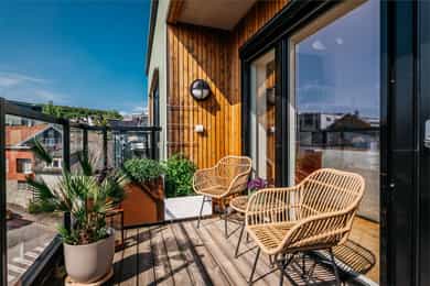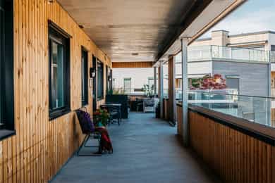 Morgensol på svalgangen/terrassen som ligger mot øst. Her har man sol til midt på dagen. Videre har man sol på terrassene mot vest helt frem til sent på kvelden.