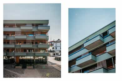 Kombinasjonsbygg oppført i betong og bindingsverkskonstruksjoner. Utvendig kledd med trekledning, fasadeplater og pussede flater. Leiligheten har malte trevinduer med tre-lags glass. Utvendig bestått med aluminiumsbeslag. Leiligheten har isolert inngangsdør og terrassedører med glassfelt. Til leiligheten er det to vestvendte balkonger. Balkong med tilkomst fra stue er 12 m2. Balkong med tilkomst fra kjøkken er 6,8 m2. Balkongene har beiset terrassegulv og glassrekkverk. I tillegg har leiligheten en 6 m2 balkong mot øst i tilknytning til felles svalgang. Denne har gulv av betong og kledning som rekkverk.