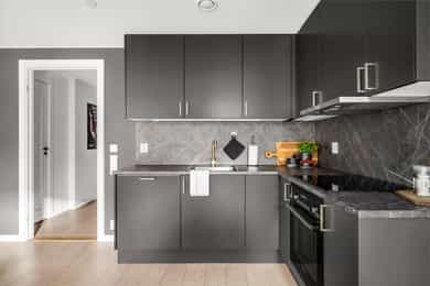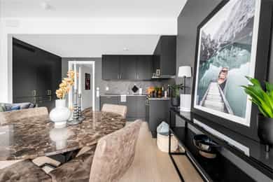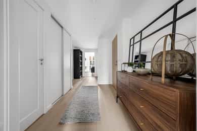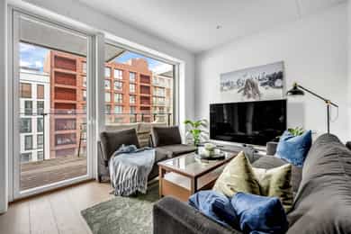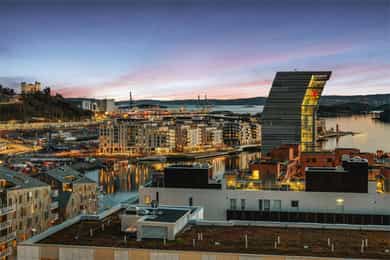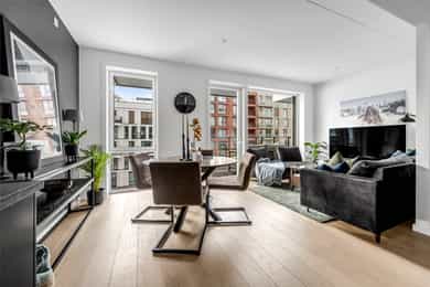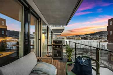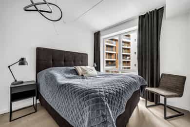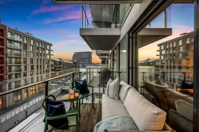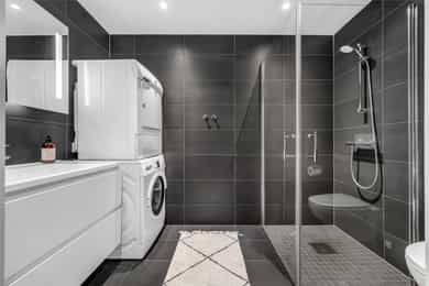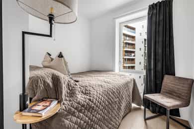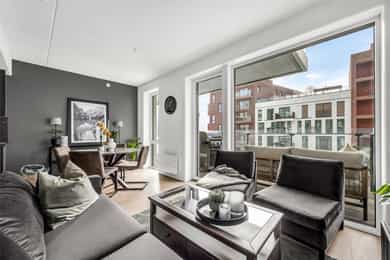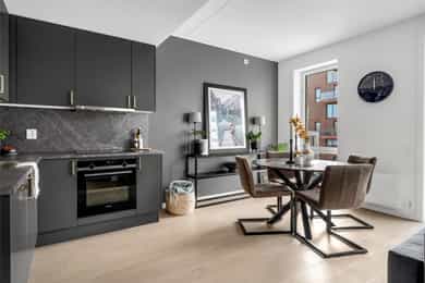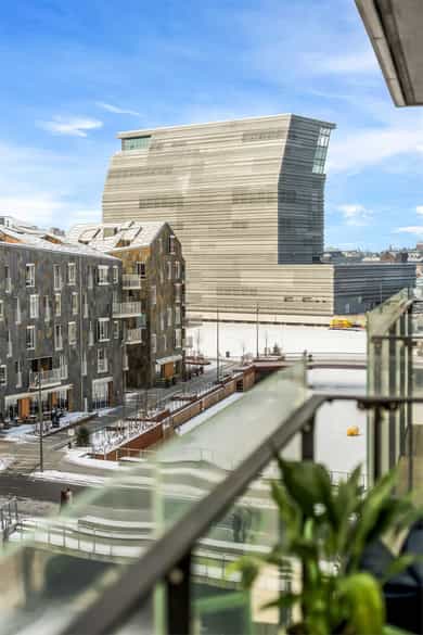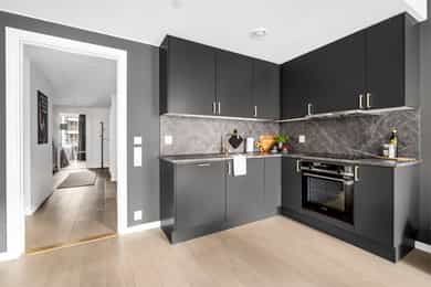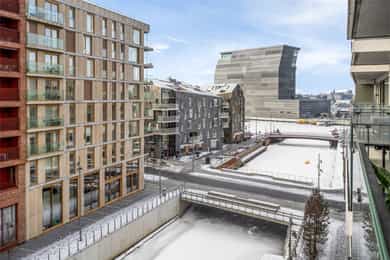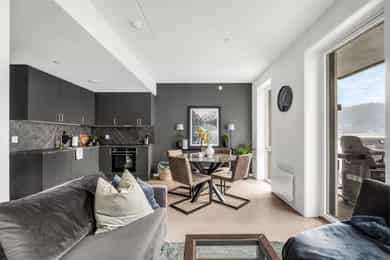 Entré: Leiligheten ligger i byggets 5. etasje og har heisadkomst til leilighetsplan. Vel inne møter du en romslig og innbydende entré med god plass til å henge av deg yttertøy. Gangen har gode oppbevaringsmuligheter med garderobeskap. Stue: Delikat og romslig stue med direkte utgang til en stor vestvendt, terrasse på 7m². Terrassen har plass til ulike utemøbler og vender med utsikt mot fjorden, Munch og Middelalderparken. I stuen er det god plass til sofagruppe, spiseplass og TV- møblement. Leiligheten har lekkert parkettgulv, delikate farger på veggene og en god takhøyde på 2,65 m. Store vindusflater kombinert med åpen og luftig planløsning skaper en svært behagelig romfølelse. Rommet har en velfungerende og sosial planløsning der stue, spisestue og kjøkken ligger i en sammenhengende løsning, noe som gir funksjonelle soner og mange innredningsmuligheter. Kjøkken: Lekkert kjøkken fra Sigdal, utformet i en åpen og sosial løsning. Kjøkkenet er designet med fokus på funksjonalitet, med godt med benke- og skapplass. Det har en stilren innredning med glatte fronter og benkeplate av laminat. Kjøkkenet er utstyrt med integrerte hvitevarer som induksjonstopp, stekeovn, kjøl-/fryseskap og og oppvaskmaskin. Det er også kjøkkenventilator med innebygget komfyrvakt, montert i overskap med avtrekk til balansert ventilasjonsanlegg. Bad: Romslig bad med opplegg for både vaskemaskin og tørketrommel. Badet er utført i moderne og stilrene fliser med behagelig gulvvarme. Innredningen består av servantskap med skuffeseksjon, nedfelt servant, speilskap, vegghengt toalett og dusjhjørne med glassdører. Soverom 1: Hovedsoverommet er tilknyttet bod/walk-in. Soverommet er av god størrelse med plass til dobbeltseng og tilhørende møblement. Det er godt med garderobeplass. Rommet er malt i en lun og behagelig farge og har pent parkettgulv. Soverom 2: Soverom nummer to er av god størrelse, med plass til dobbeltseng og tilhørende møblement. Rommene har flere bruksområder og kan fint benyttes som gjesteværelse, barnerom eller kontor. De er malt i behagelige farger og har pene gulv.