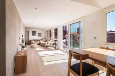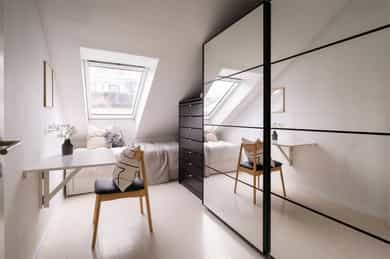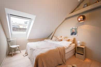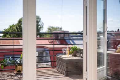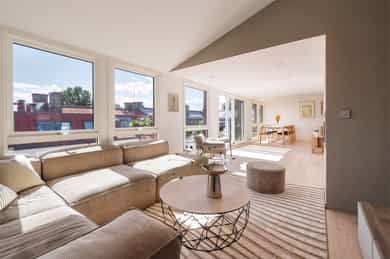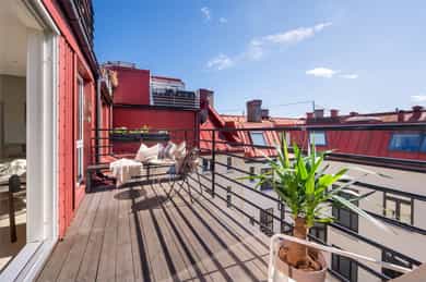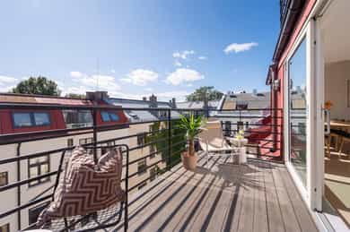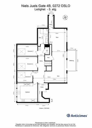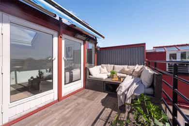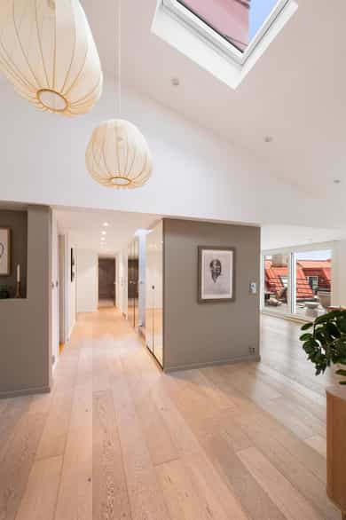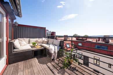 Entré: Romslig og innbydende entré med god plass til yttertøy og sko. I gangen er det plassbygd garderobe med speildører. Herfra fører trapp opp til leilighetens loftstue. Leiligheten har adkomst via felles trapperom. Stue/spisestue: Leiligheten har en romslig stue med store vindusflater som slipper inn rikelig med dagslys og gir en lys og luftig romfølelse. Fra stuen er det utgang til balkong med gode solforhold. Peisovn bidrar til lun stemning og behagelig varme på kjølige dager. Det er god plass til flere sittegrupper, og rommet lar seg enkelt dele inn i naturlige soner med egen spiseplass. Balkong: Romslig sydvestvendt balkong på 7 kvm med god plass til ønsket møblering. Balkongen har svært gode solforhold og flott utsikt, og vender inn mot en rolig bakgård. Et ideelt sted å nyte lange sommerdager og lune kvelder. Kjøkken: Leiligheten har et moderne kjøkken levert av kvalitetsleverandøren Strai. Kjøkkenet er romslig og har gode oppbevaringsløsninger i både skuffer og skap, og ble pusset opp i 2016 iht tidligere selger. Innredningen har slette fronter og benkeplate i treverk som gir et stilrent uttrykk. Kjøkkenet er fullt utstyrt med kombinert kjøle og fryseskap, kjøleskap, fryseskap, vinskap, oppvaskmaskin, mikrobølgeovn, stekeovn og platetopp. Det er også plass til en mindre spisegruppe som passer perfekt til hverdagsmåltider. Bad: Delikat flislagt bad som ble pusset opp i 2016 i regi av tidligere eiere. Badet har servant fra HTH med gode oppbevaringsløsninger og et stort speil med integrert belysning som gir både god funksjon og økt romfølelse. Dusjhjørnet er nedsenket og utstyrt med både hånddusj og regndusj for et moderne uttrykk. Vegghengt toalett, praktisk opplegg for vaskemaskin og gode oppbevaringsmuligheter. Varmekabler i gulv gir ekstra komfort. Hovedsoverom: Leiligheten har et romslig hovedsoverom med takvindu som slipper inn godt med naturlig lys. Soverommet har god plass til dobbeltseng med tilhørende møblement. Soverom 2: Det andre soverommet er også av god størrelse og har plass til seng med tilhørende møblement. Her har man også plass til garderobeløsning. Soverom 3: Det tredje soverommet er i dag brukt som garderobe / kontor, men egner seg like godt som gjesterom eller barnerom. Her har man plass til garderobeløsning. Toalettrom: Pent toalettrom med flislagt gulv med varmekabler og malte vegger. Toalettrommet ble fornyet i 2016 iht selger og har vegghengt servant med ettgreps armatur samt vegghengt toalett med innebygget sisterne. Rommet egner seg godt som praktisk og delikat gjestetoalett. Loftsstue: Trivelig loftstue som passer utmerket som tv stue, med god plass til både sittegruppe og tv benk. Herfra er det utgang til en romslig, privat takterrasse. I tillegg er det tilgang til krypeloft med rikelig oppbevaringsplass. Takterrasse: Stor, privat og sydvestvendt takterrasse på 12 kvm med rikelig plass til både sittegruppe og spiseplass. Takterrassen byr på strålende solforhold og flott utsikt, med sol fra omtrent soloppgang til solnedgang iht selger. Diverse: - Varmekabler i alle rom unntatt ett soverom - Gulv: Gulvflater belagt med parkett og fliser. - Vegger: Vegger i malte, slette flater. Veggflater belagt med malte strietapeter i gang. - Tak: Takhøyder er målt på tilfeldige steder i boligen. Det er målt mellom 0,68 og 3,65 meter takhøyde i 5. etg. Det er målt mellom 1,15 og 2,46 meter takhøyde i 6. etg. Himlinger i malte, slette flater. - Vinduer og dører: Slett entrédør. Skyvedør med tre-lags glass fra 2023. Terrassedør på loft med to-lags glass fra 2017. Vinduer med tre-lags glass fra 2023. Takvinduer med tre-lags glass fra ca. 2020. Vinduer og takvinduer på loft med to-lags glass fra mellom 1986 og 2019.