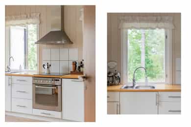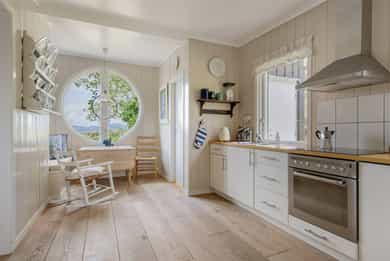 Entré: Det er adkomst til boligen via opparbeidet uteområde og hyggelig terrasse. I gangen er det god plass til oppbevaring av sko og yttertøy. Kjøkken: Flott, romslig spisekjøkken fra 2007. Innredning med lyse, glatte fronter og heltre benkeplate med oppvaskkum i stål. Hvitevarene består av integrert komfyr og platetopp og frittstående kjøleskap. Det er mekanisk ventilator over platetopp. Det er godt med lagringsplass i overskap, benkeskap og skuffer. På kjøkkenet er det en hyggelig spisekrok ved vinduet. Fra kjøkkenet er det adkomst til vaskerommet. Spisestue: Mellom kjøkkenet og stuen har boligen en fantastisk spisestue. Her er det god plass til stor spisegruppe. Hit kan du fint invitere over både venner og familie på et bedre måltid. Rommet har store vindusflater med herlig utsikt. Stue: Boligen har en lys og innbydende stue av god størrelse. Det er fint plass til sofagruppe med tilhørende sofabord og tv-møblement. Stuen er romslig, og kan enkelt innredes på flere, naturlige måter. Rommet har store vindusflater som sikrer godt lysinnslipp. Fra boligen er det åpent, grønt og herlig utsyn uten sjenerende innsyn eller gjenboere. Flott, lukket peisovn sikrer god varme, og bidrar til hyggelig stemning. Selger opplyser at peisovnen er fra 2007. Overflatene i stuen består av tapet på to av veggene og tre-stavs parkett. Fra stuen er det utgang til hagen. Tre soverom: Boligen har en svært barnevennlig planløsning med god tilknytning mellom de tre soverommene via gangen. På hovedsoverommet er det god plass til dobbeltseng, nattbord og innebygd garderobeskap langs den ene veggen. Soverommet har flott, originalt gulv og to store vindusflater med grønt utsyn. Fra soverommet er det direkte adkomst til eget bad. Badet er romslig, og holdt i nøytrale farge- og materialvalg. Rommet ble pusset opp i 2017, og har flislagte overflater og mekanisk ventilasjon. Det veggmontert toalett, badekar og baderomsinnredning med skuffer, servant i innredning og speil. De øvrige rommene passer godt som barnerom, gjesterom eller hjemmekontor, og har alle god plass til både seng, skrivepult og skap. Bad med adkomst fra gang: Moderne bad med adkomst fra gangen. Badet ble pusset opp i 2017, og har overflater med fliser på gulv, våtromsplater på vegg og slette malte flater i himling. Rommet inneholder veggmontert toalett, dusjhjørne med innfellbare glassdører og baderomsinnredning med skuffer, servant og vegghengt speilskap. Badet er ventilert med mekanisk ventilasjon. Vaskerom: Praktisk vaskerom med adkomst fra kjøkken. I rommet er det opplegg for vaskemaskin og 200LVV bereder. Rommets innvendige overflater består av fliser på gulv og malt panel på vegger og i tak. Eier opplyser at rommet er pusset opp i 2007. - Overflater - Boligens innvendige overflater består av parkett og heltregulv på gulv, malt panel og tapet på vegg og malt panel og malte plater i tak. - Uteplasser - Til boligen er det en 19 m2 overbygget uteplass og en 19 m2 terrasse langs husveggen. I fbm. inngangsparti er det en 12 m2 platting. Ved inngangspartiet er det en 3,5 m2 utvendig vedbod. - Oppgraderinger i senere tid - 2017 Ny takpakk på tak 2017 Renovert bad i gang. 2016 Bygget utestue. 2007 Renovert bad ved soverom. 2007 Bygget vaskerom 2007 Oppgradert kjøkkeninnredning 2007 Skiftet deler av boligens røropplegg. 2007 Skiftet inngangsdør. 2007 Monterte ny vedovn i stue.