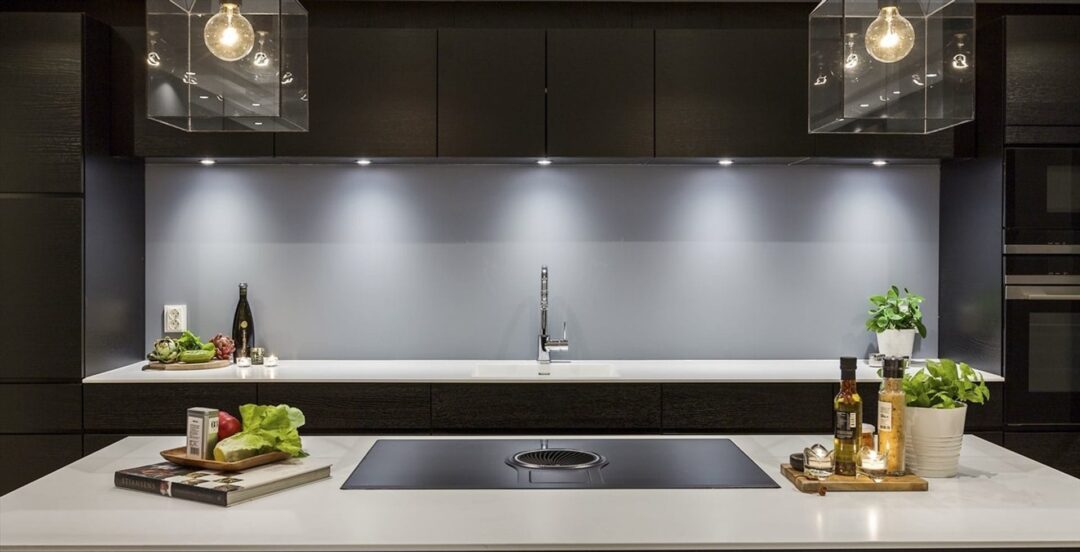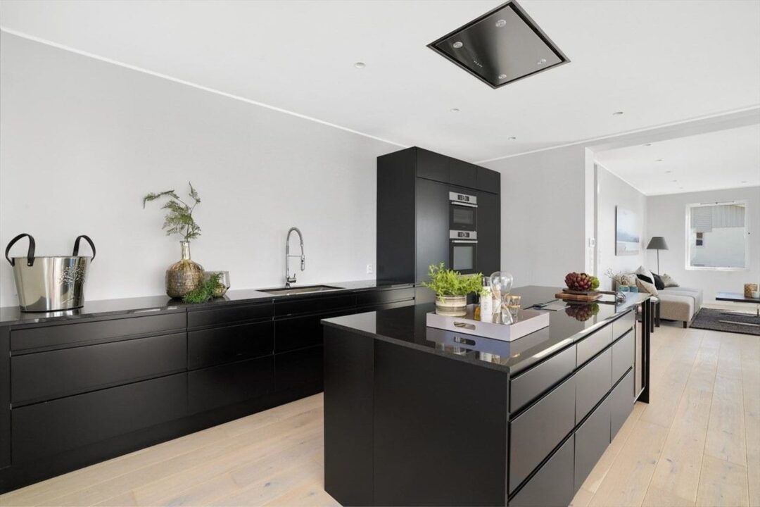 – Mørke kjøkken er fortsatt trendy, og overflatene harmonerer godt med fargen på veggen. Med integrert ventilator i platetoppen slipper man matos og lukt, i tillegg til at man unngår overhengende vifte, viser Laila.