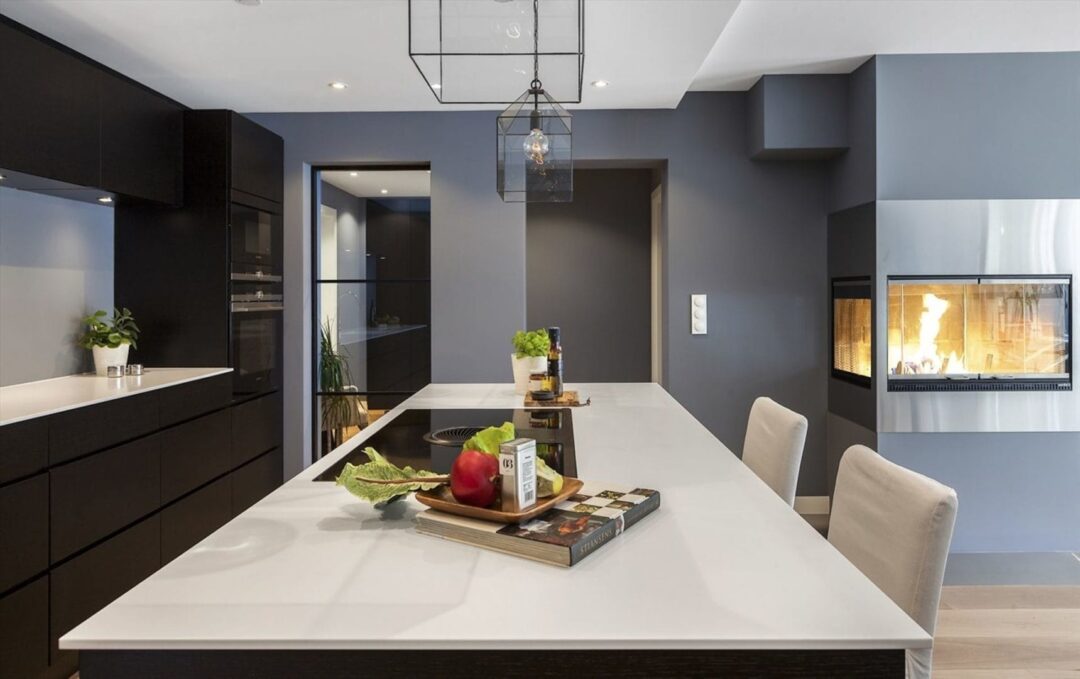 – Et fint og hyggelig kjøkken med flotte detaljer som peis, vakre lamper og glassvegg mot stue. Man får en åpen løsning samtidig som man får skillet mellom kjøkken og stue. Det blir to soner men likevel en åpen og luftig følelse, sier Laila.