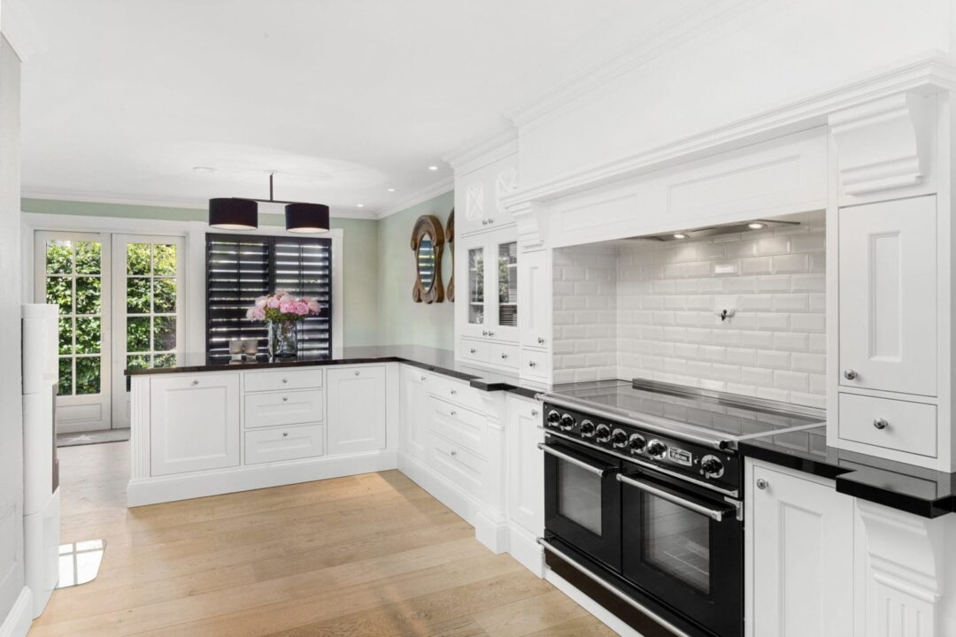 – Flott klassisk kjøkken med hvit farge på innredning og lys grønn farge på veggene. Fordelen med å kombinere hvite kjøkkenflater og farge på veggene er det tidløse uttrykket. I tillegg er det enklere å male veggene enn å skifte kjøkkeninnredningen. Det er en stor fin komfyr og to stekeovner som er veldig praktisk for de som kokkelerer mye. Det er også et fint dekorelement i kjøkkenet, legger Laila til.