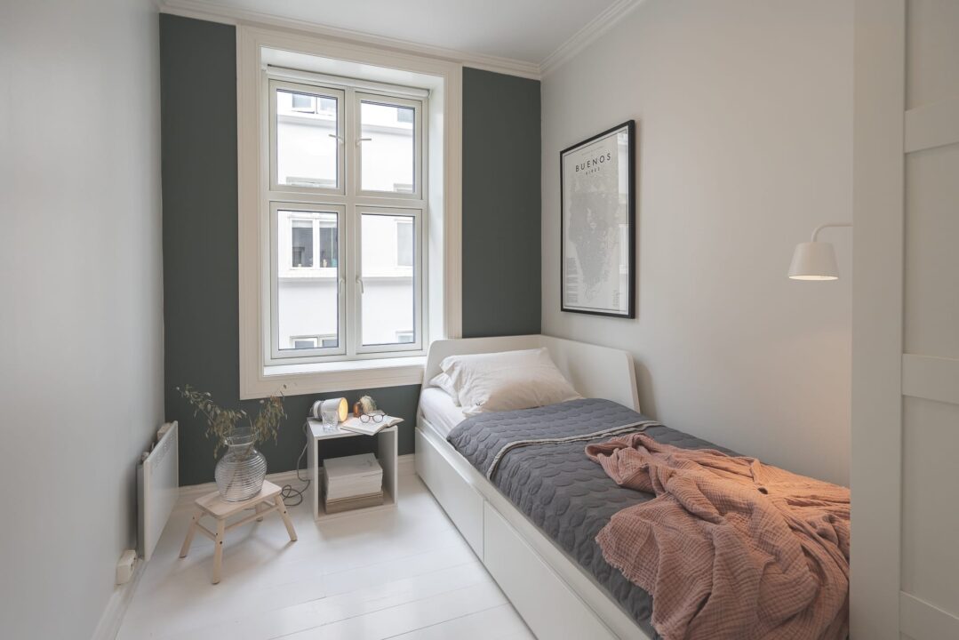 Gjesterommet har en blågrønn kontrastvegg. Rommet brukes både av gjester, og som oppbevaring.