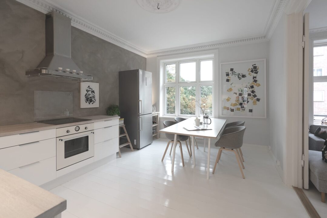 – Vi elsker at leiligheten har flere moderne trekk som bryter med det klassiske, som for eksempel de sorte kontrastveggene, og kalkveggen på kjøkkenet, fortsetter Bård.