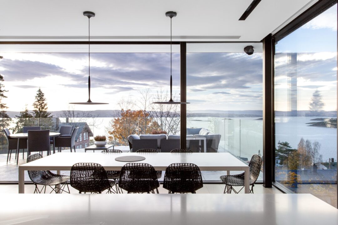 Og med den vakre solnedgangen som eneste gjenboer, krever det gode skjermingsmuligheter. Som det første prosjektet i Norge er det installert 45-graders vindusskjerming uten rammer, som styres fra mobilen.