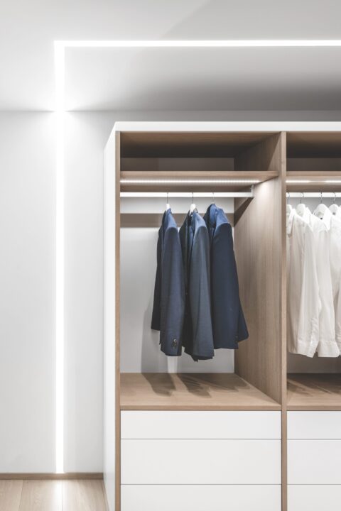 – Dette er så mye mer enn et møbel der man oppbevarer klærne sine. Vi har laget et «walk-in-closet» som en egen sone, og det fungerer som romdeler mellom inngangen og sengen. Med dagslys fra den ene siden av rommet, fant vi ut at det fineste ble en åpen løsning uten dører.