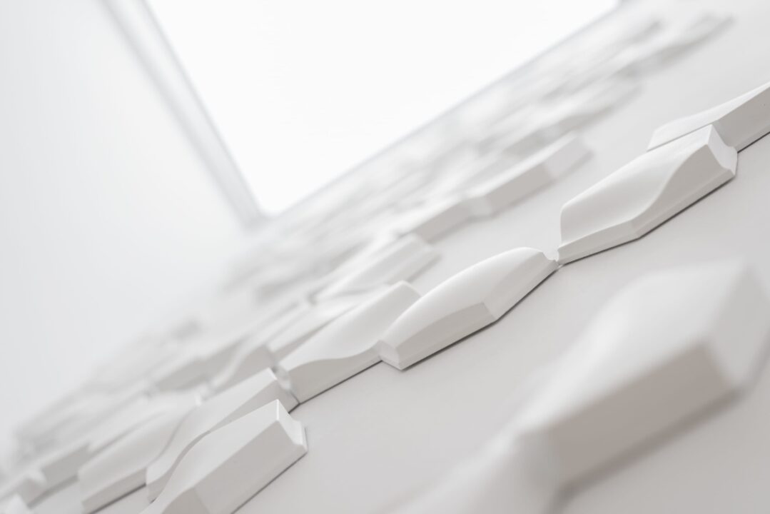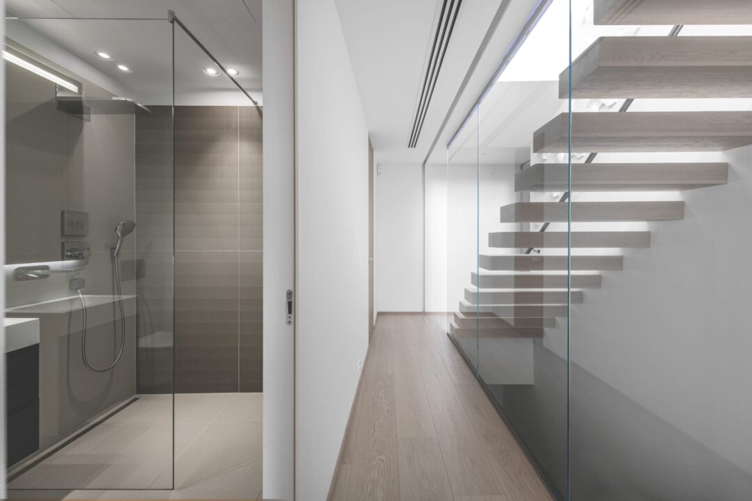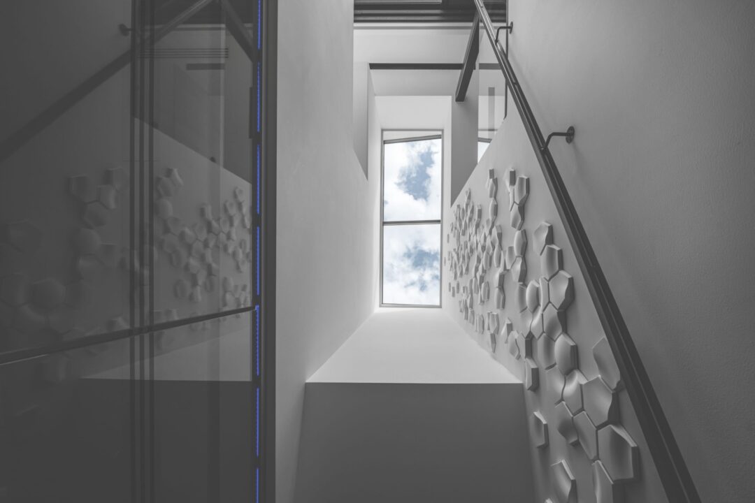 Går man oppover den svevende trappen, danner flisene et subtilt og grafisk mønster. Veggene strekker seg helt opp til takvinduet, og man kan skimte blå himmel.