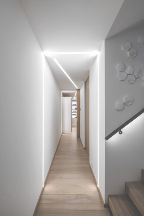 En lysplan for hele huset ble laget allerede i prosjekteringsfasen. Interiørarkitekten anbefaler at man begynner med dette tidlig i prosessen, slik at man får innfelte lyskilder og skjulte ledninger, forteller eier.