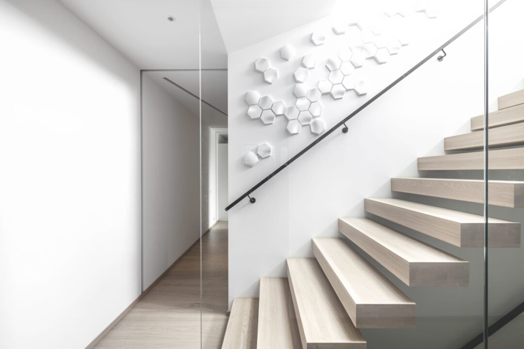 – Denne trappen er helt fantastisk! Vi satt opp glassveggen på den ene siden, som demper akustikken. På den hvite veggen har vi satt opp fliser fra «Casa Concrete» i dekorform, en spesiell detalj man ikke finner mange andre steder.