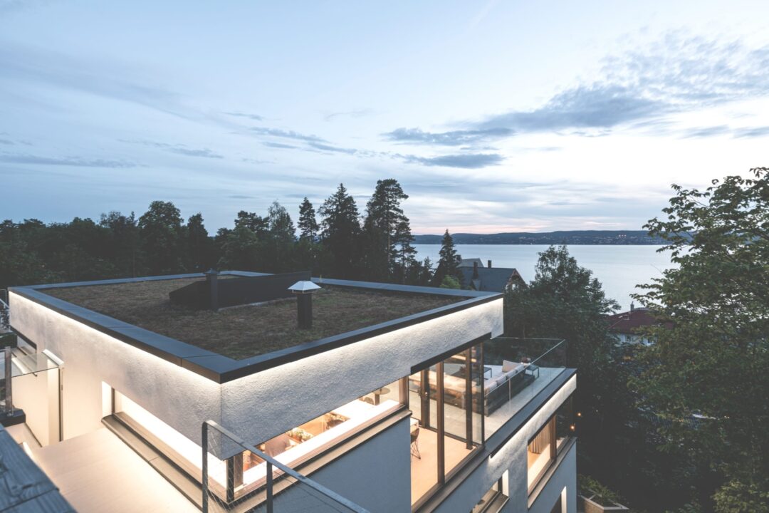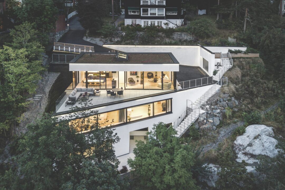 Hvitt, sort, glass, aluminium og eik dominerer dette huset på tre etasjer som speider ut over Oslofjorden. Med to mil utsikt fra badekaret og en svevende trapp, er huset fullt av detaljer, overraskelser og følelsen av ferie.