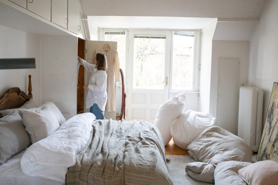 Kathrine Høgh, designer og innreder, styler soverommene i duse farger og henger inn utvalgte klær i skapene. – Jeg vil gjerne vise frem at de har innebyggede skap, det er så utrolig fint, og ganske spesielt.
