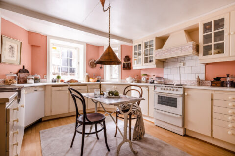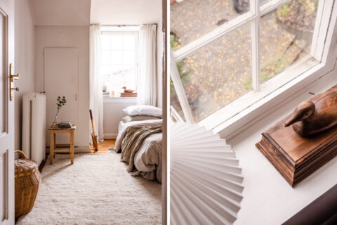 Kathrine Høgh, designer og innreder, styler soverommene i duse farger og henger inn utvalgte klær i skapene. – Jeg vil gjerne vise frem at de har innebyggede skap, det er så utrolig fint, og ganske spesielt. Huset har beholdt så mange originale detaljer så jeg håper virkelig de nye eierne tar vare på dem, sier hun.