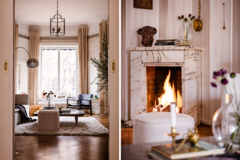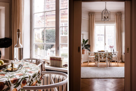 Halvdan Svartes gate har mange detaljer som Anders vil fremheve. Den spesielle marmor-peisen i stua blir dekorert med skulpturer og blomster, og de store sprossevinduene omrammet med lin-gardiner fra gulv til tak. I tillegg har de myke tepper i alle rom som perfekt kontrast til de originale parkett-gulvene. – Duken med fersken er ganske markant, jeg kan ikke bruke den i alle prosjekter, men her gir den en fin edge til rommet synes jeg.