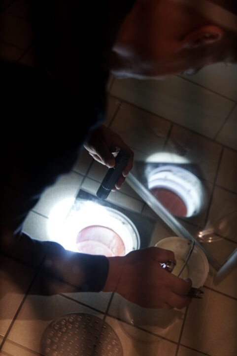 – Nå ser jeg etter slukmansjetten og membran, sier takstmannen Thomas A. Nordby fra Anticimex idét han lyser lommelykten ned i sluket.