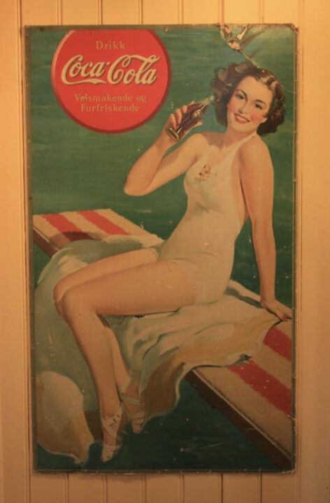I gangen har vi hengende et klenodie vi avduket under et lag med tapet og maling - en reklameplakat for Coca Cola. En av ildsjelene i historielaget her sjekket opp opprinnelsen og man kom til at den var fra 1939 og kunstneren som har tegnet det som den gang var en lettkledd dame, var amerikansk.