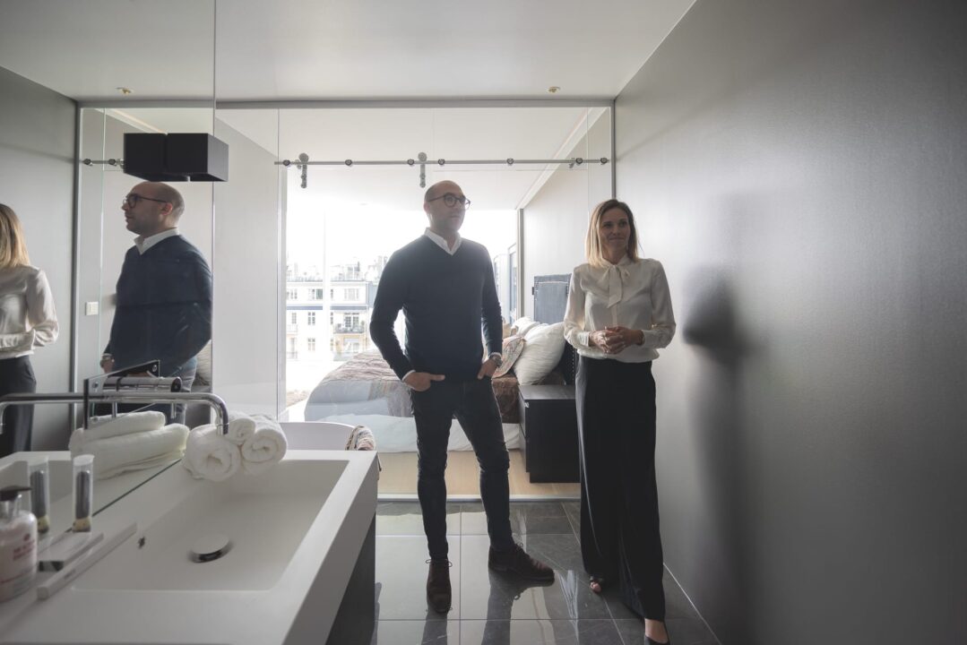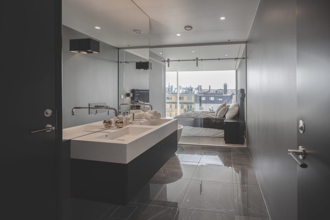 Det er ikke den eneste overraskende bruk av glassflater i loftet. Mellom hovedsoverom og bad er det også benyttet vegg og skyvedør av glass.