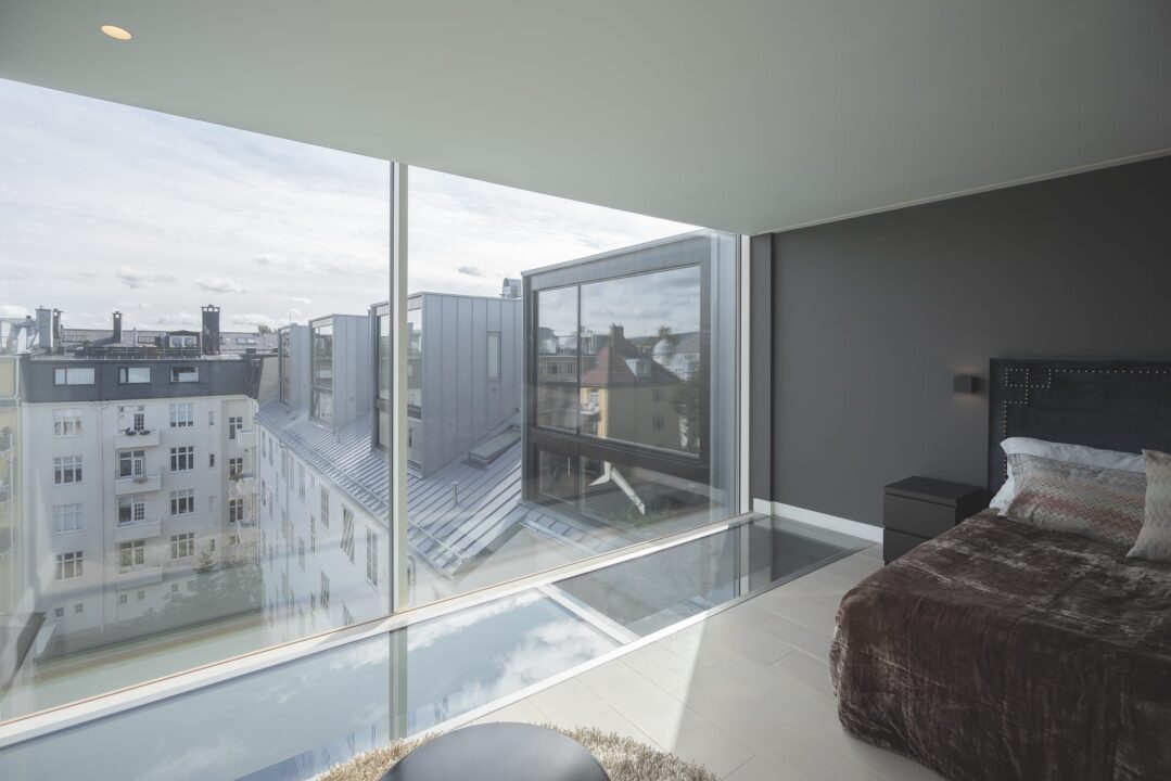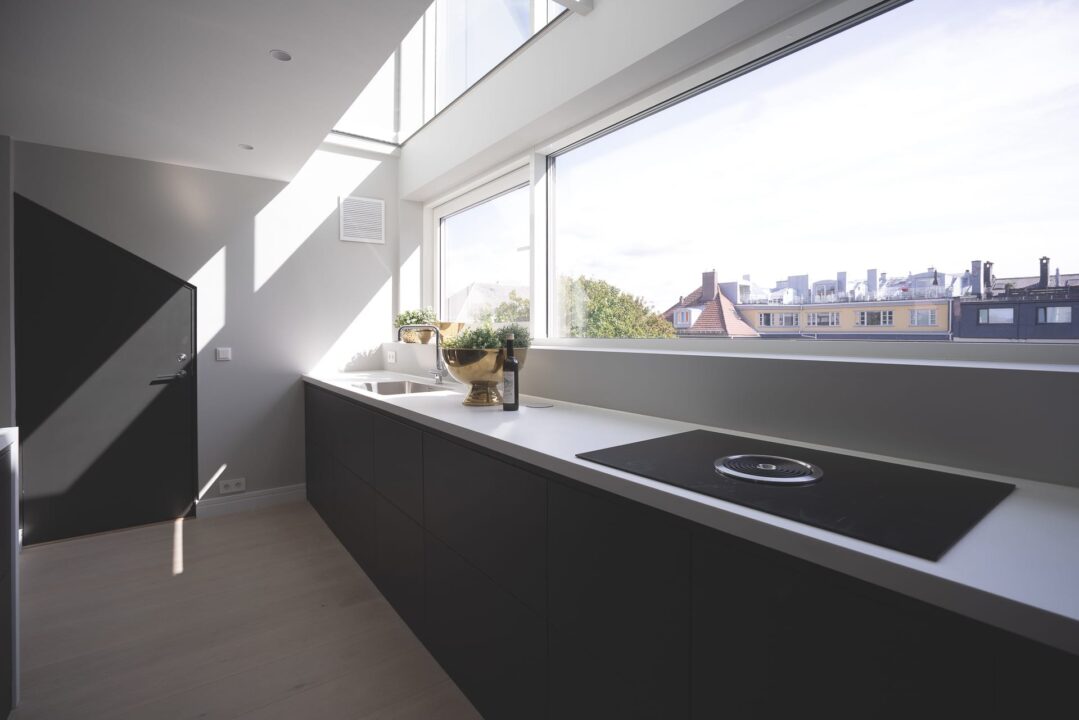 Ikke minst er hele soverommets yttervegg et vindu. Fra kjøkken og soverom har man intet mindre utsyn enn gjennom en 5 x 5 m stor vindusflate. For solskjerming anbefaler Caroline plissegardiner eller tolags gardiner som på hotell.