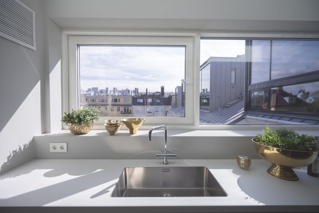 Integrert benkeventilator sikrer lys og utsyn fra kjøkkenvinduet.