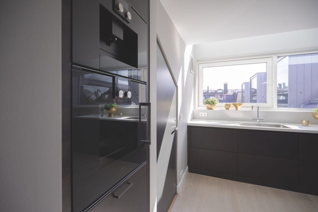 – Vi ser helt klart en økende trend fra lukket til åpen kjøkkenløsning, det er noe folk ønsker seg. Hadde vi lukket av kjøkkenet her hadde vi ikke fått gjennomlyset, som jo er helt essensielt i denne boligen. Det er også grunnen til at vi valgte å unngå overskap og overhengende vifte på kjøkkenet, det ser vi også blir stadig mer populært, legger Caroline til.