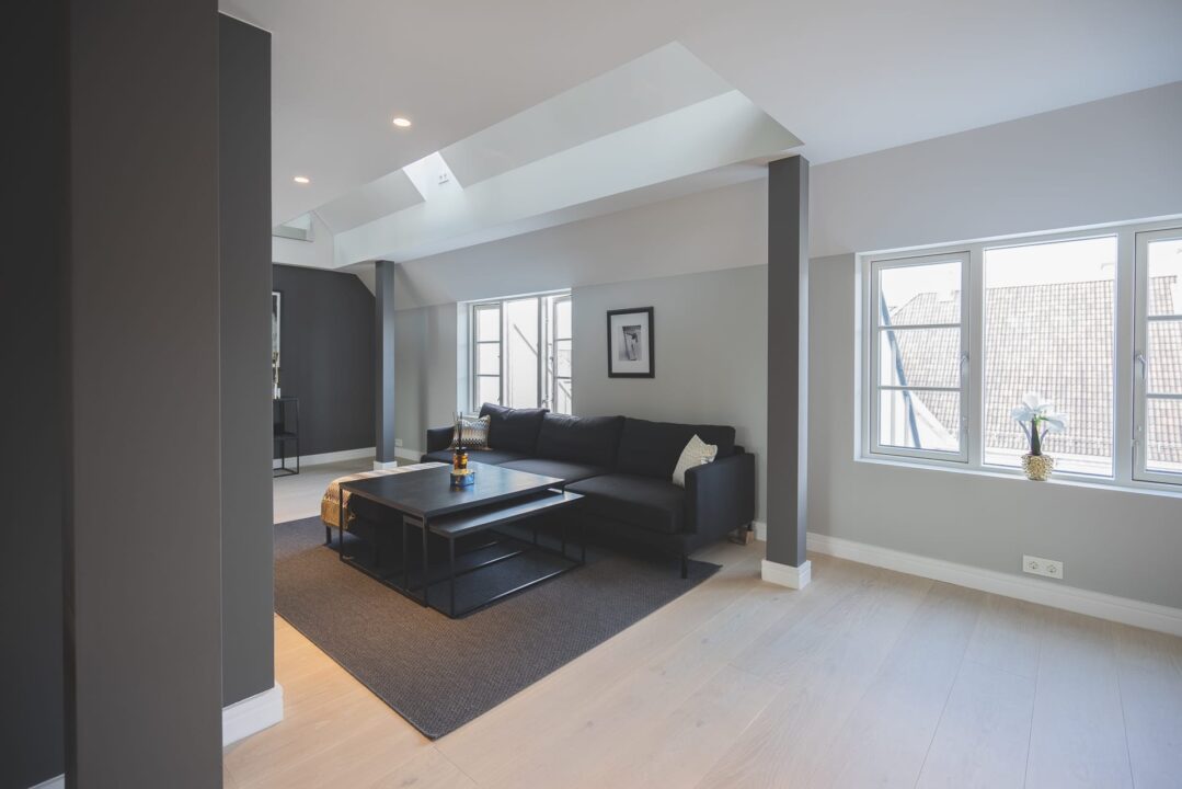 I loftsleiligheten er det valgt mørke detaljer og tunge møbler, som står i fin kontrast til hvitoljet eikeparkett og naturlig lys gjennom store vindusflater.