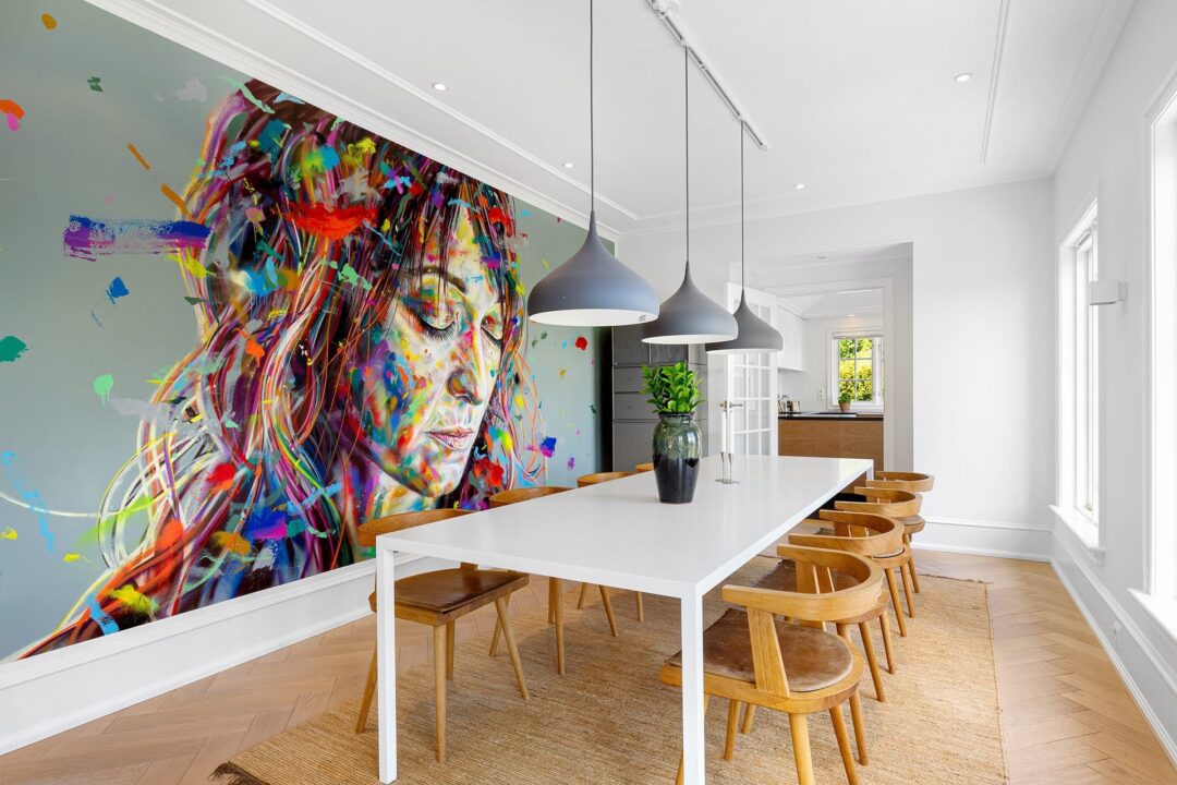 Her har den anerkjente gatekunstneren David Walker, som vanligvis maler husfasader, fått utfolde seg på veggen over spisestua. Jobben tok en uke.