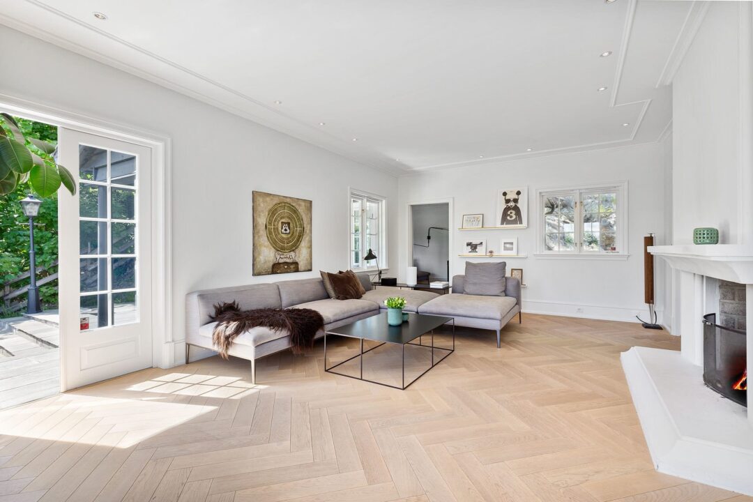 - Vi hentet til og med danske håndverkere for å legge fiskebensparketten, forteller eieren. Parketten er hvit oljet, i prima kvalitet uten kvaster, kjøpt ved Inpro AS i Billund i Danmark.