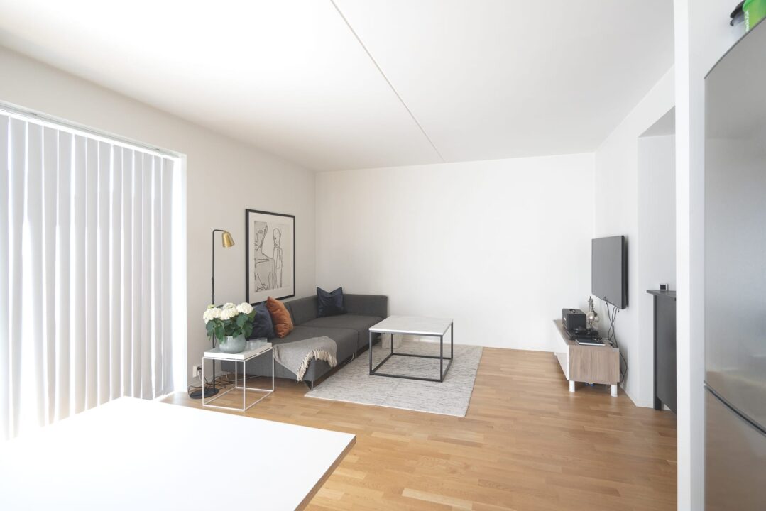 – For å skape en såkalt nøytral grunn bør man fjerne personlige eiendeler når foto skal tas og man inviterer til visninger. Gjerne behold noe interiør så det fortsatt er hjemmekoselig og ikke ser fraflyttet ut. I denne boligen ville jeg for eksempel latt fjølene av marmor stå fremme på kjøkkenet, sammen med noen urter og kokebøker. Både sofaen og stuebordet er stilriktig, jeg ville kun kjøpt inn enda flere puter i sofaen. Stålampen ved sofaen har ingen funksjon på en visning nå på sommeren, så den ville jeg pakket vekk. Man må tilgjengeliggjøre så mye gulvplass som mulig, da oppleves rommet større, sier Beatrice.