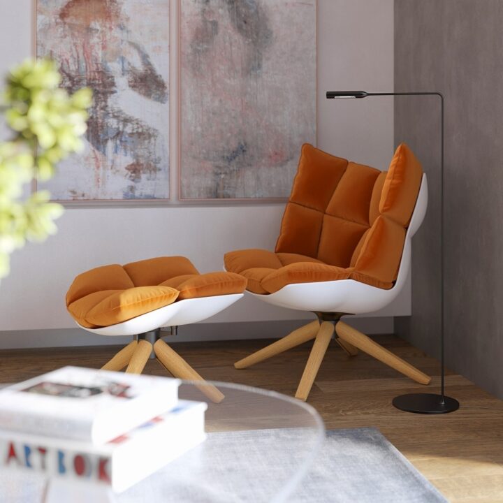 Flo er en hel famile med lamper og den er praktisk laget med bryter på enden av hodet. Dermed trenger man ikke lete etter bryter som ligger ledning gjemt under eller bak en sofa. Hodet er vridbart og det samme er stangen festet i gulvbasen. Det er to innstillinger for lyset og lden everes i mange farger slik at man kan tilpasse uttrykk etter interiøret.