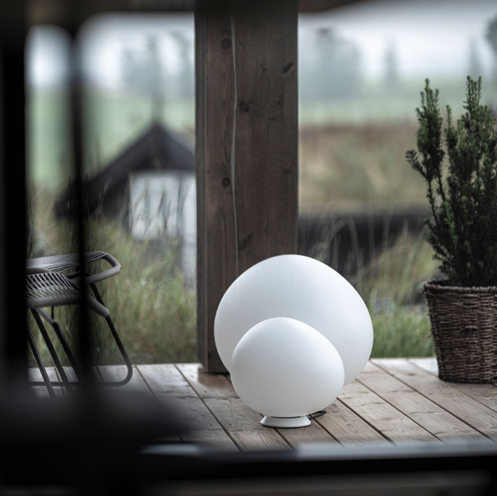 Gregg leveres i flere størrelser og for både gulv og tak. Det å plassere flere lamper sammen gir en fin effekt. Lampene gir et jevn lys og er med på å lyse opp mørke området.