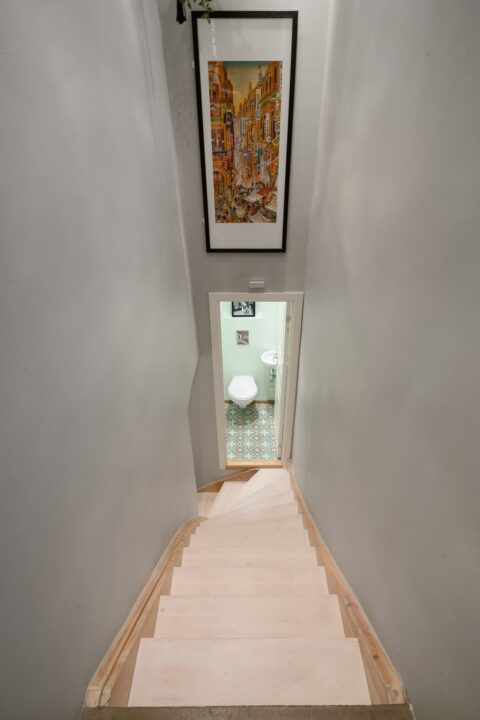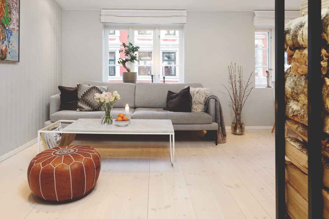Inn døren og tre trappetrinn ned kommer man inn i en lun og hyggelig stue, som umiddelbart kjennes som et hjem ulikt alt det man assosierer med sentrumsnær treroms i Oslo.