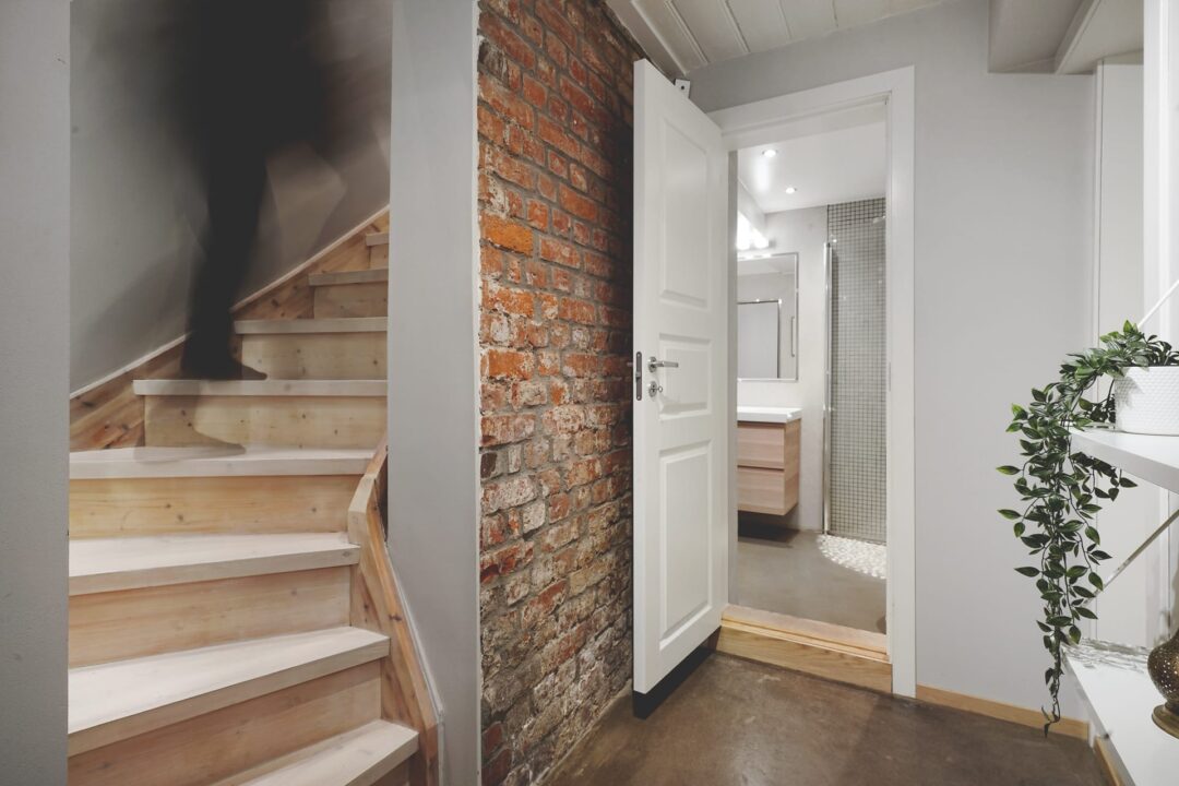 Gulvet i gangen og på badet i første etasje er malt med epoxymaling. Det holder seg pent lenge, er enkelt å rengjøre, og gir en industriell look som gjør seg godt med den bevarte mursteinsveggen. Veggen fortsetter opp til kjøkkenet, blant orginalbjelke