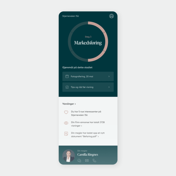 I appen har du full oversikt over prosessen til en hver tid, enkel tilgang til megler og full kontroll på hva du trenger å gjøre til hvilken tid.